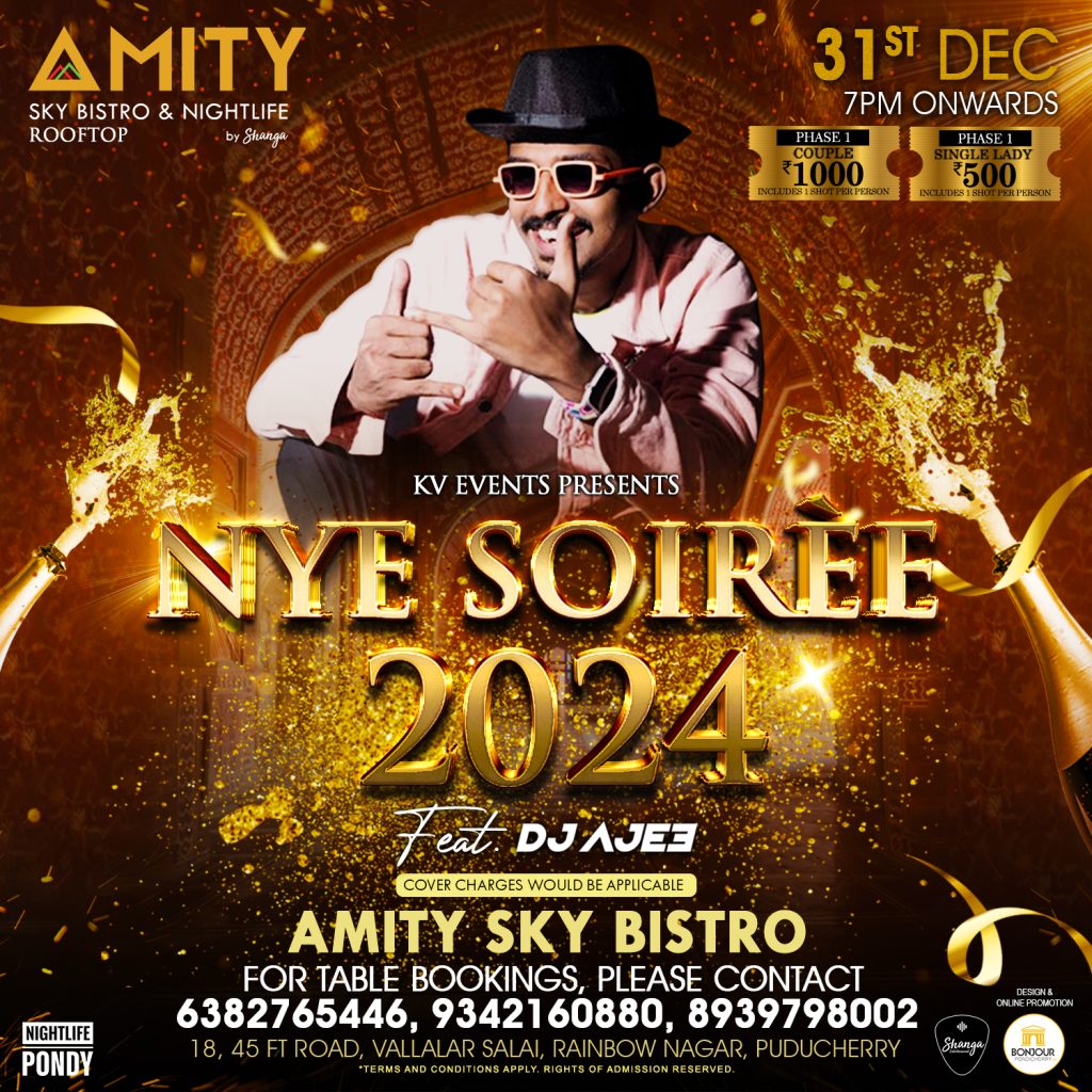 Experience: Ring in 2024 with a Brazilian-themed restopub, liquor, snacks, and a wild ‘Carnivàle’ party at Amity Sky Bistro & Nightlife, Puducherry, featuring DJ Gowtham, the official DJ of Rockstar Anirudh! Date: 31st December, starting at 7:30 pm. For booking call: 6382765446
