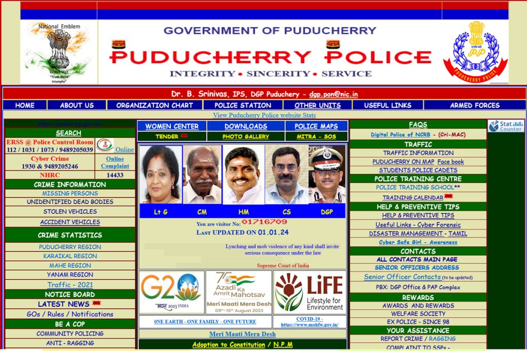 The detailed yet user-friendly Police Department website offers important notifications, contact information, and a citizen portal for complaint registration. Features include mail IDs for reporting complaints and an application process for verifications.