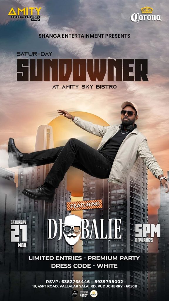 #SundownerVibes #AmitySkyBistro #PondicherryEvents #DJBalie #SaturdayNight #PartyInPondy #NightlifeIndia #PremiumParty #WhiteParty #SunsetParty #WeekendVibes #PondyNightlife #DJNight #ClubVibes #LimitedEntries #EventAlert #PartyModeOn #MusicLovers #BeachCityVibes #LuxuryNight #DanceNight #BonjourPondicherry 🔥✨