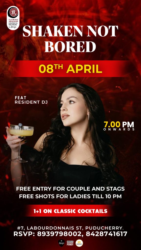 Get ready to stir up your midweek with Shaken, Not Bored—Pondicherry’s most vibrant Wednesday night experience! Whether you’re craving bold Asian flavors or a dancefloor escape, this is your midweek fix.