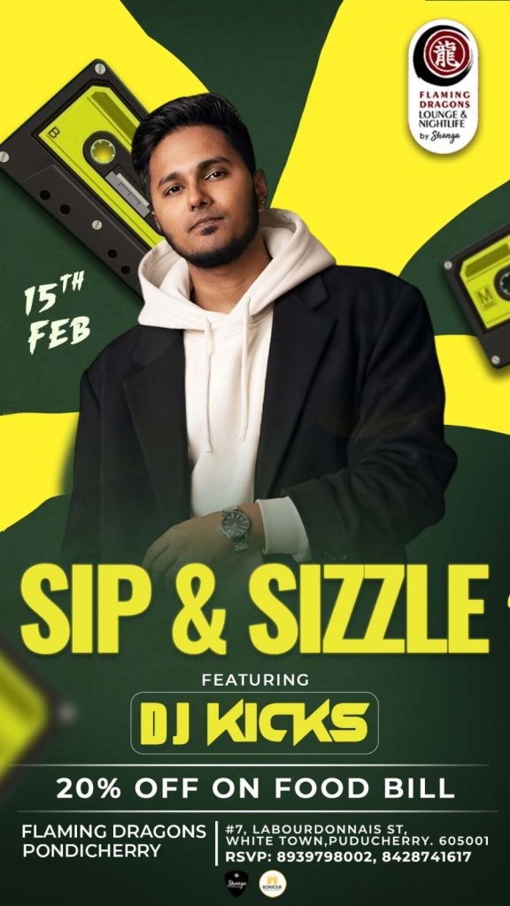 #FlamingDragons #PuducherryNightlife #DJKicks #SipAndSizzle #WhiteTownVibes #SundayFunday #PondicherryEvents #LoungeAndNightlife
