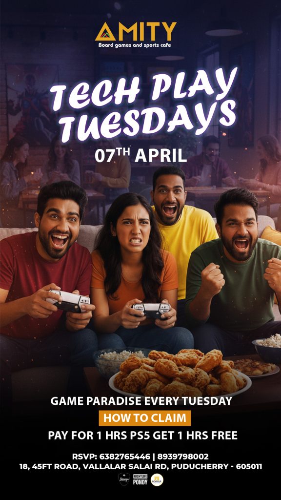 #TechPlayTuesdays #AMITYCafe #PS5Gaming #PondyGamers #BoardGamesAndBites #PondicherryEvents #GameParadise #PlayAndChill #TuesdayVibes #CouchCoopFun #BonjourPondicherry