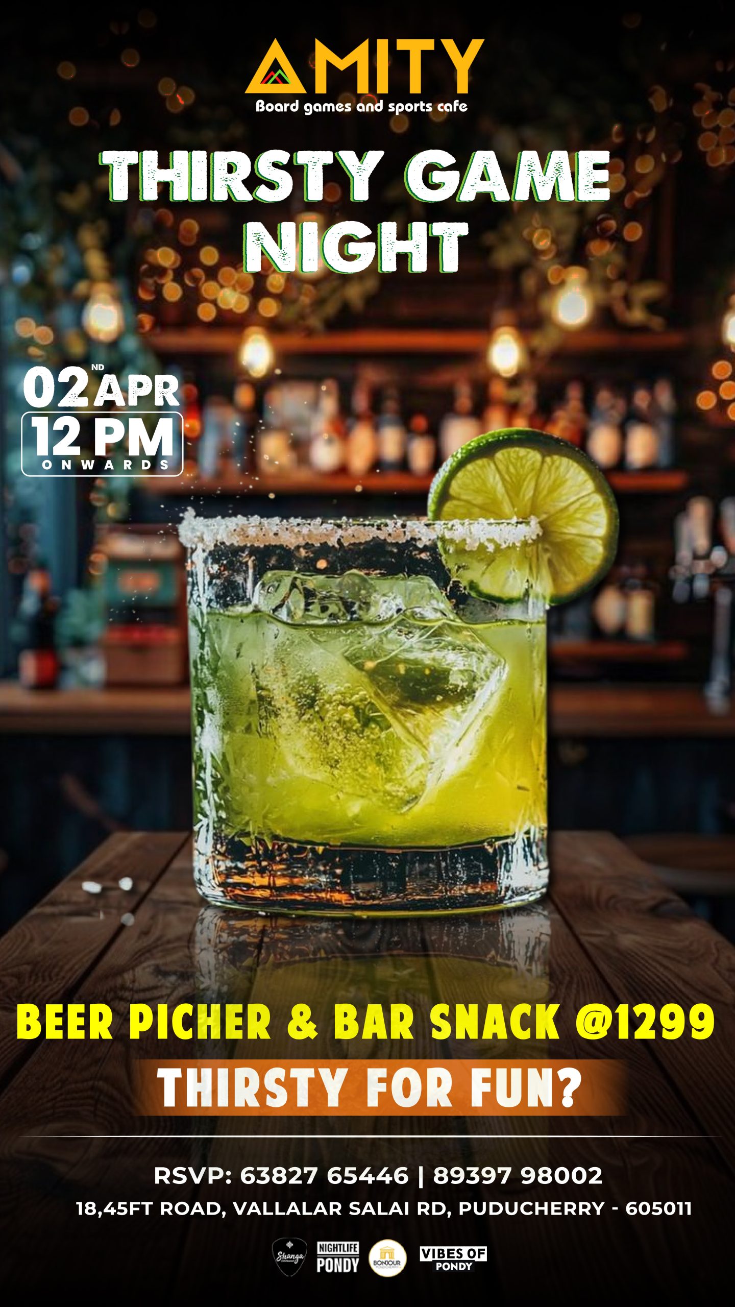 MIDWEEK MATCH-UP AT AMITY Ditch the dumbbells — it’s game night, not gym night! This Wednesday, March 01st April, starting 12 PM onwards, AMITY Board Games and Sports Cafe invites you to level up your midweek with laughter, strategy, and friendly competition. What’s on the table? From pool and board games to card battles and casual challenges, we’ve got the perfect setup for your crew to unwind and reconnect. Combo Deal: Play for 3 hours at just ₹599 for a group of 4 — unbeatable value for unbeatable fun. Where to find us: 18, 45FT Road, Vallalar Salai Rd, Puducherry - 605011 RSVP to lock in your spot: 63827 65446 | 89397 98002 Tables fill fast — bring your A-game and your best mates! #MidweekMatchup #AmitySportsCafe #Nightlife #Midweek #ComboDeal #BonjourPondicherry