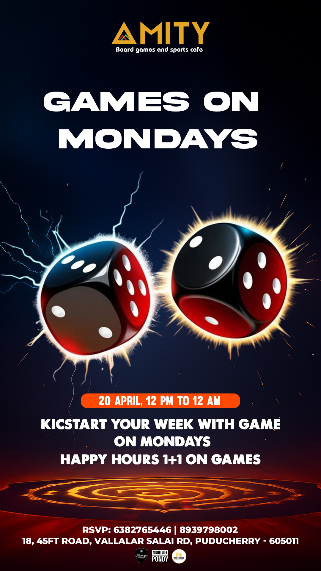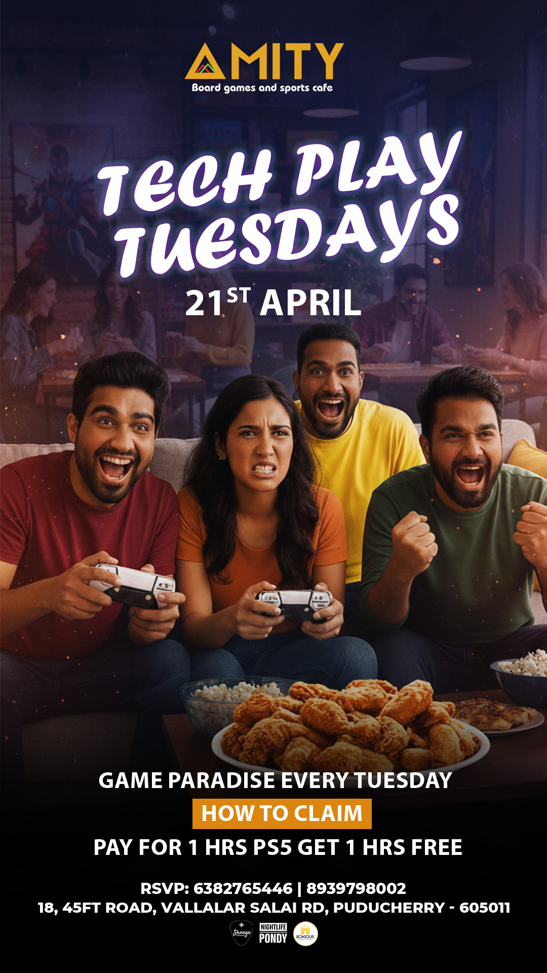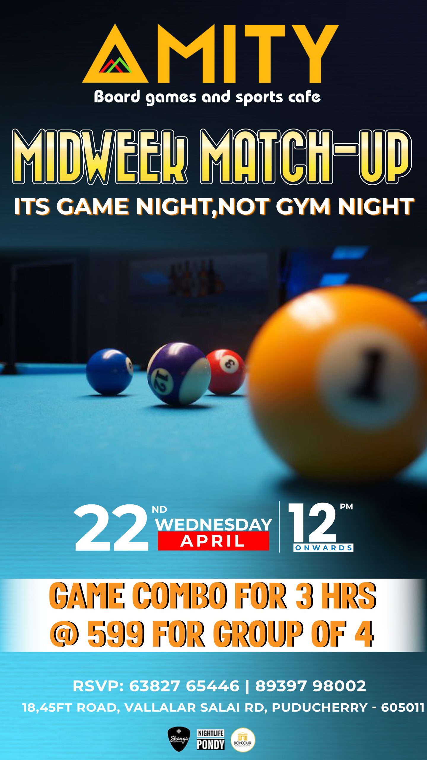 MIDWEEK MATCH-UP AT AMITY Ditch the dumbbells — it’s game night, not gym night! This Wednesday, March 01st April, starting 12 PM onwards, AMITY Board Games and Sports Cafe invites you to level up your midweek with laughter, strategy, and friendly competition. What’s on the table? From pool and board games to card battles and casual challenges, we’ve got the perfect setup for your crew to unwind and reconnect. Combo Deal: Play for 3 hours at just ₹599 for a group of 4 — unbeatable value for unbeatable fun. Where to find us: 18, 45FT Road, Vallalar Salai Rd, Puducherry - 605011 RSVP to lock in your spot: 63827 65446 | 89397 98002 Tables fill fast — bring your A-game and your best mates! #MidweekMatchup #AmitySportsCafe #Nightlife #Midweek #ComboDeal #BonjourPondicherry